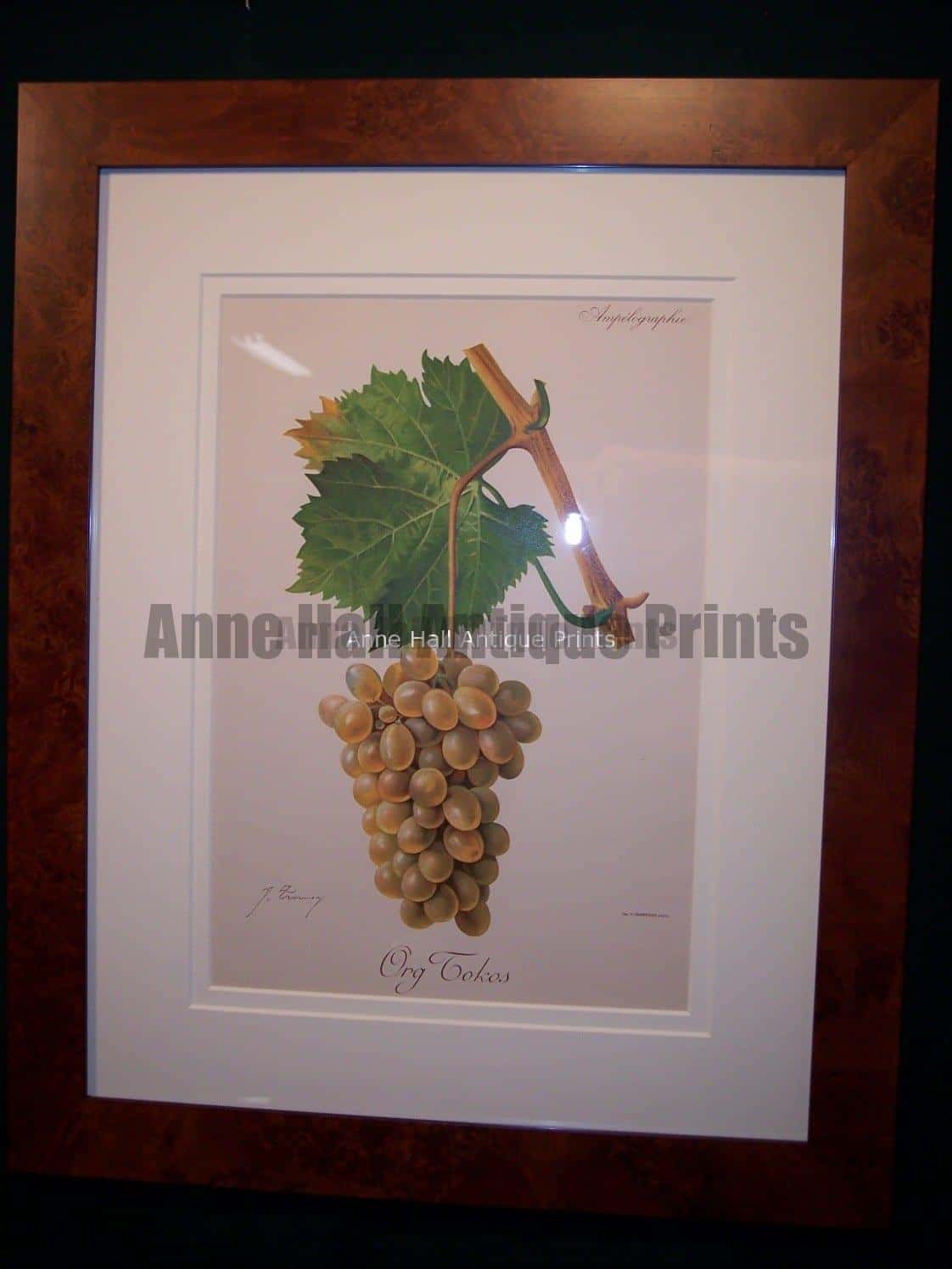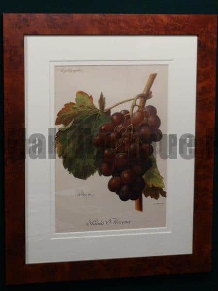 Here are some of our available framed antique wine prints ready to hang. The French work Ampelographie or vinicultural grapes, framed up, look great! Lovely and bright antique color lithographs of wine grapes with beautiful archival framing. Each 1897 French chromolithograph has a double rag mat and UV glass. The complementary picture frame molding is a high end, solid wood satin burl, about 1/2″ deep. Finished dimensions: 18×22″. For additional pieces, custom framing for a personalized set and shipping quotes call 413-245-4197.