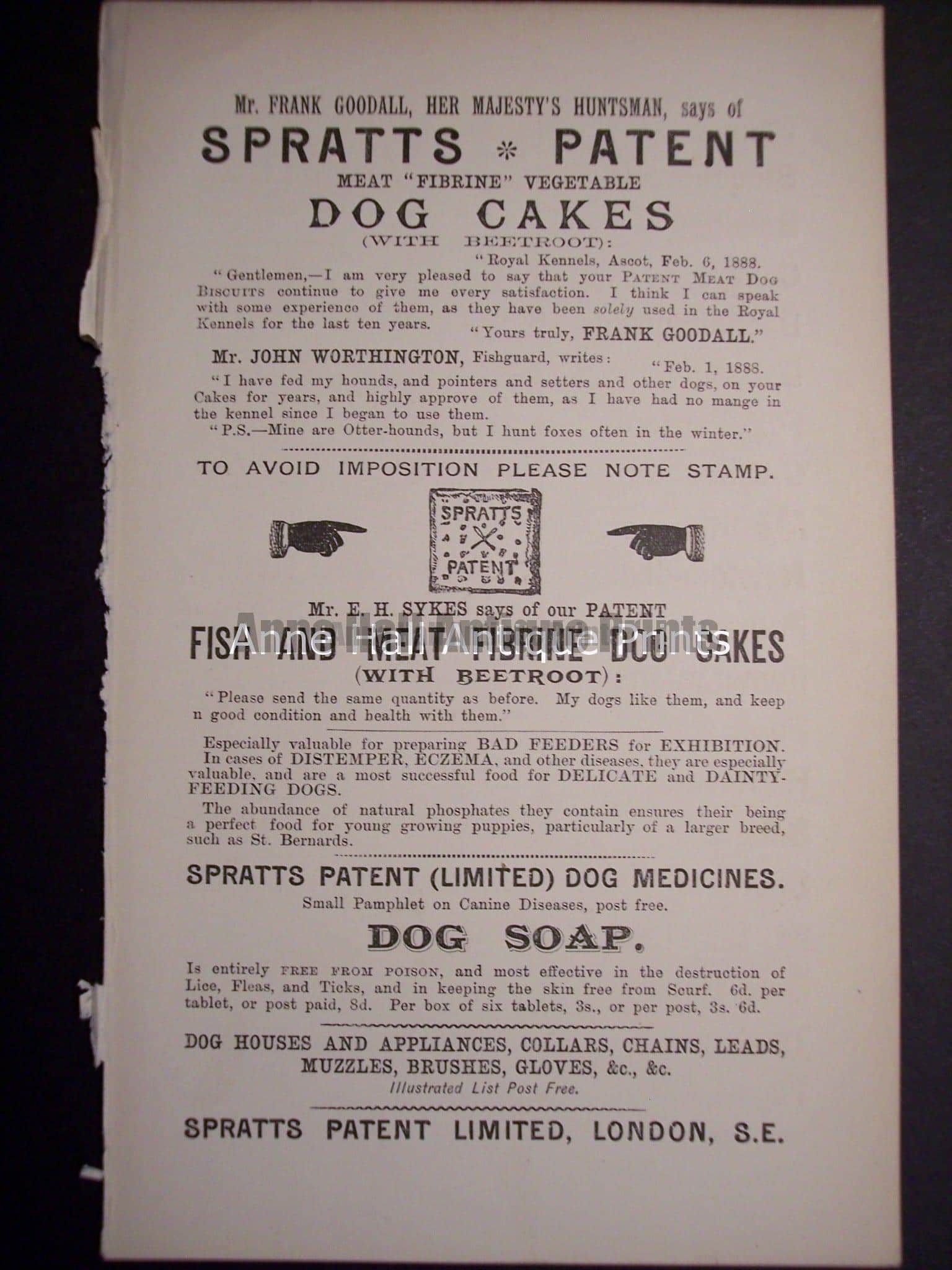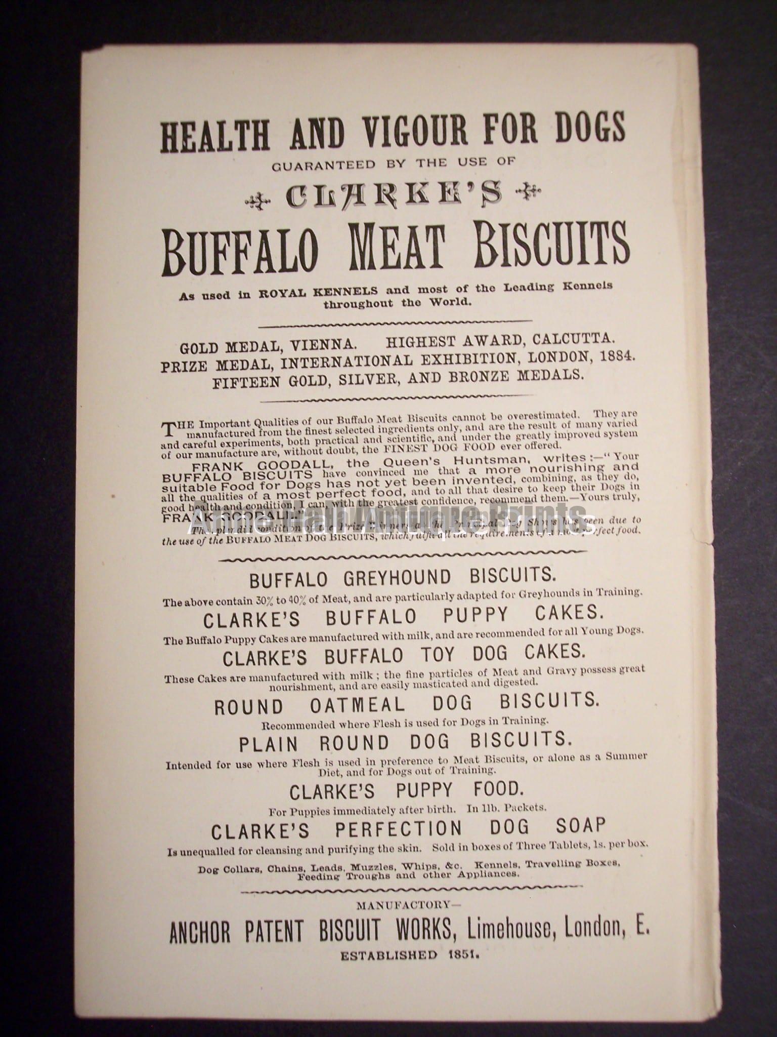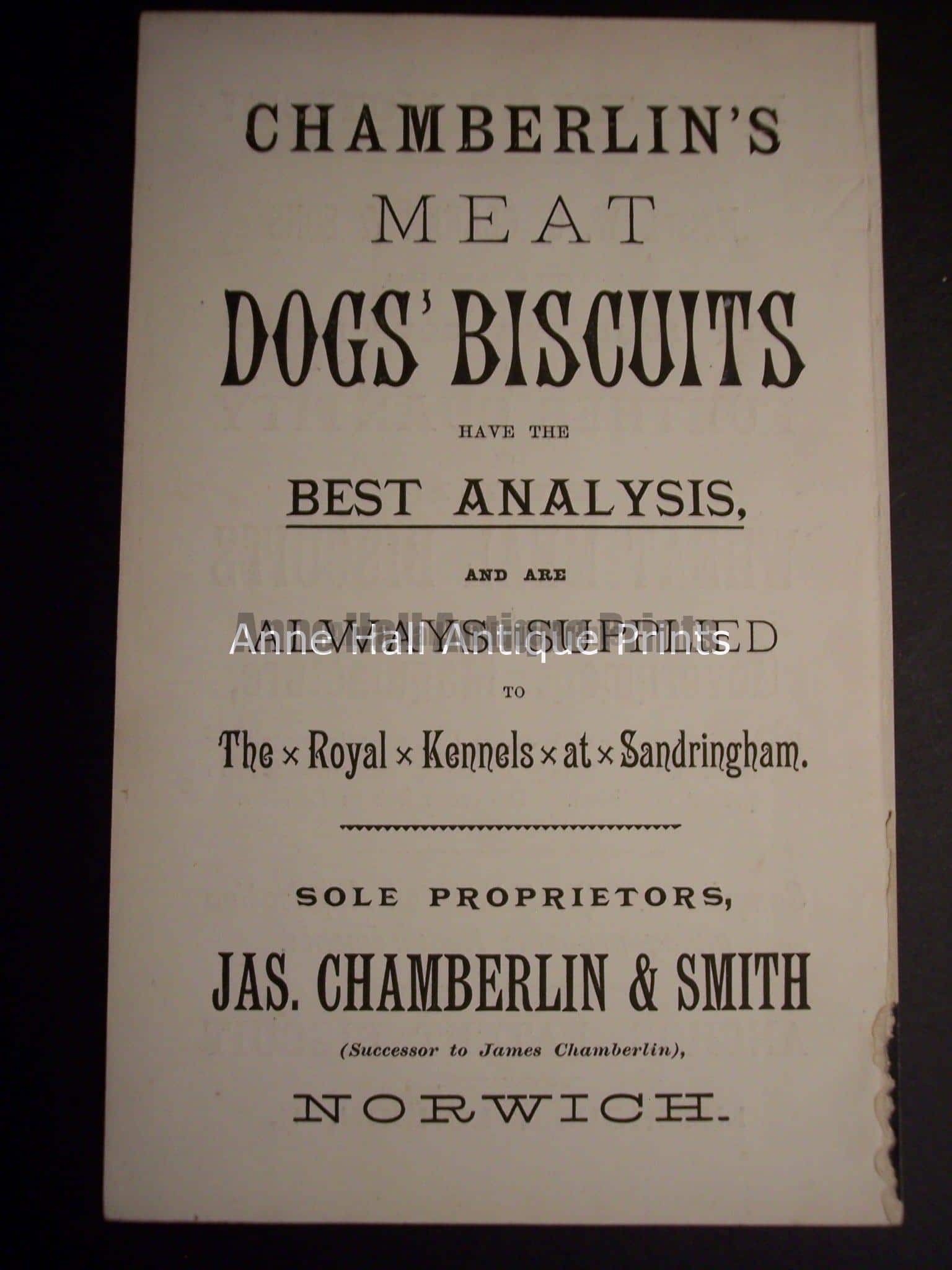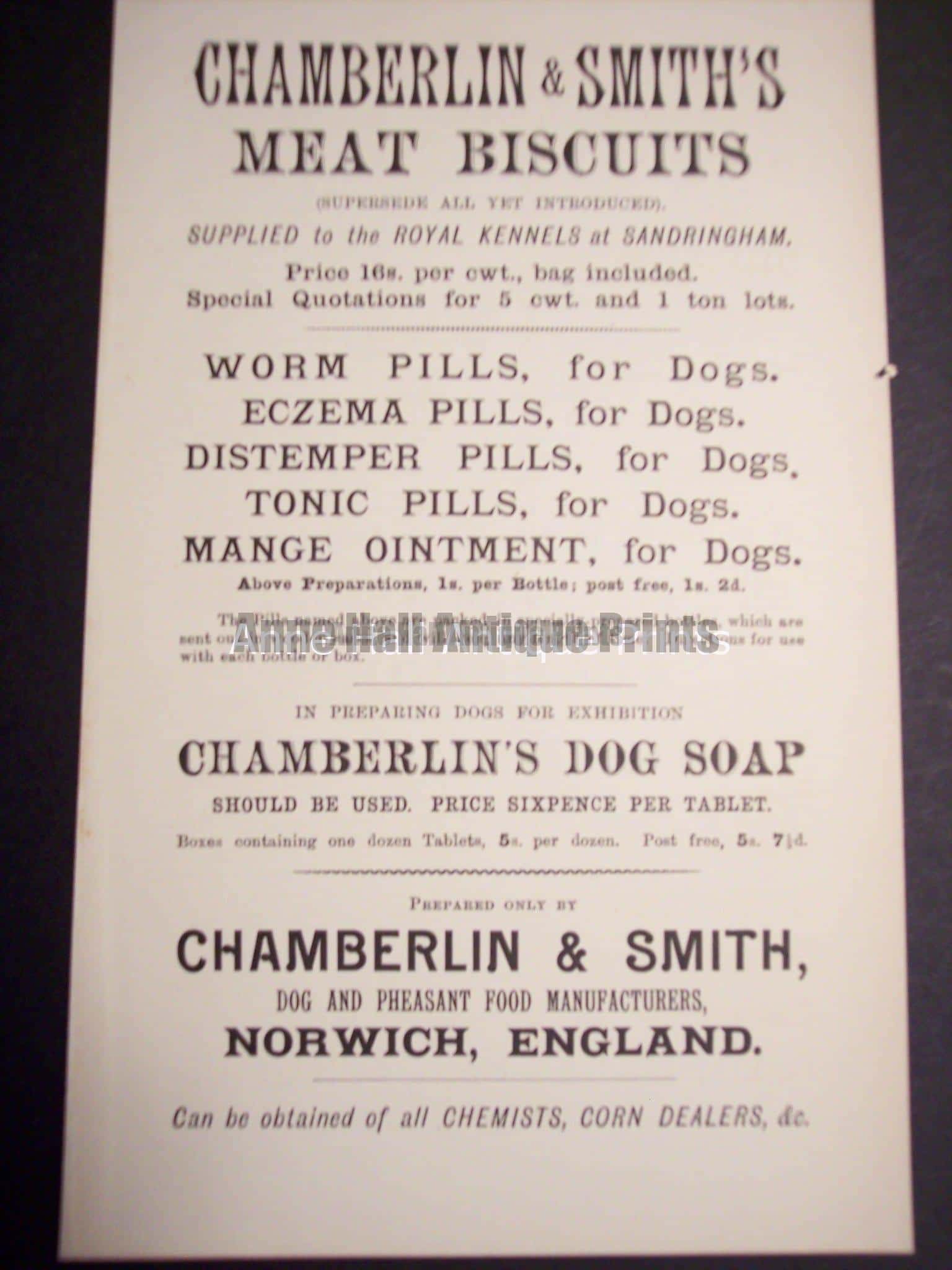 Ephemera on dogs vitamins, foods and treats from c.1900, measuring about 5×8 1/4″ and are $45. each. 2 for $80.