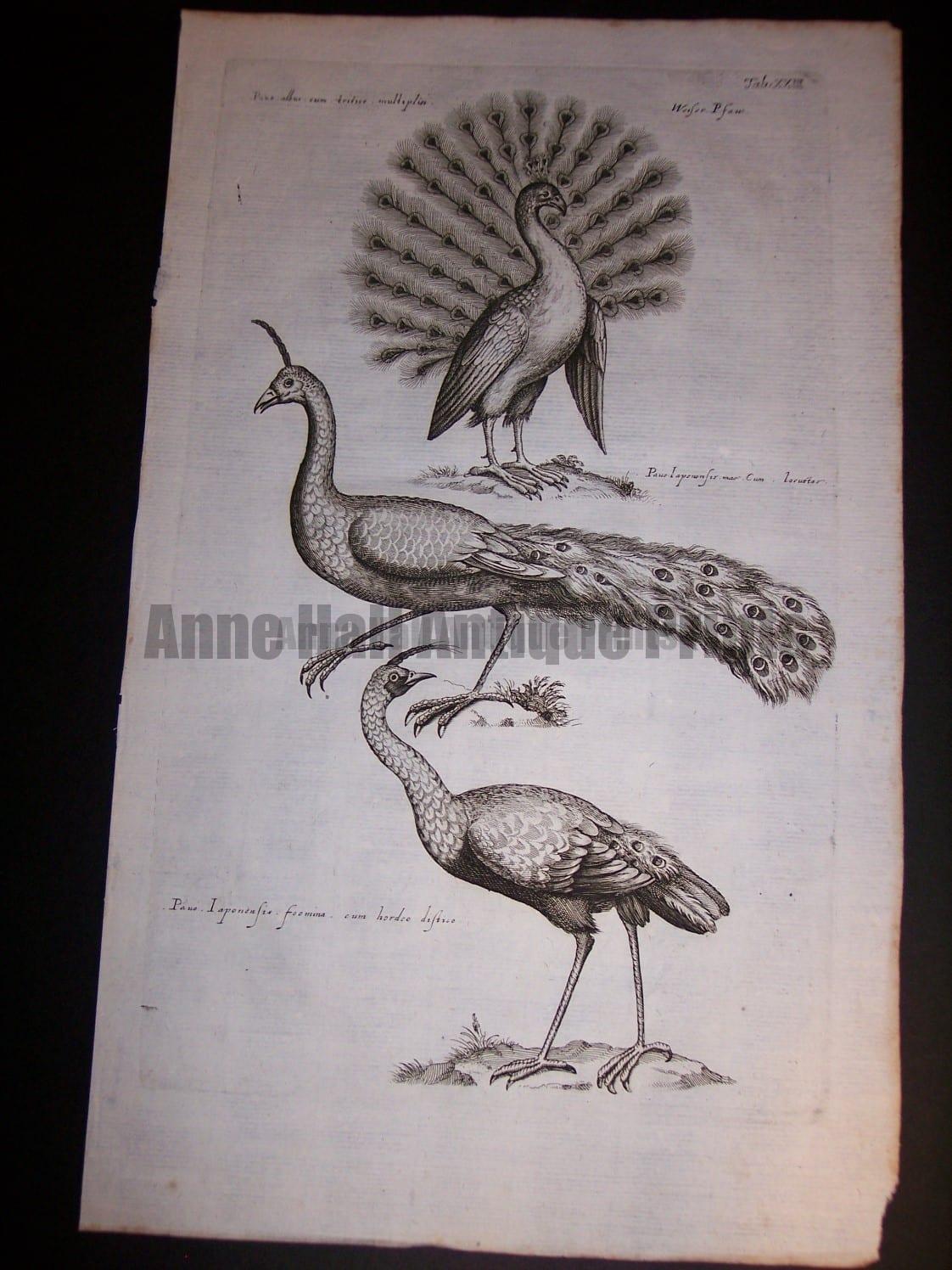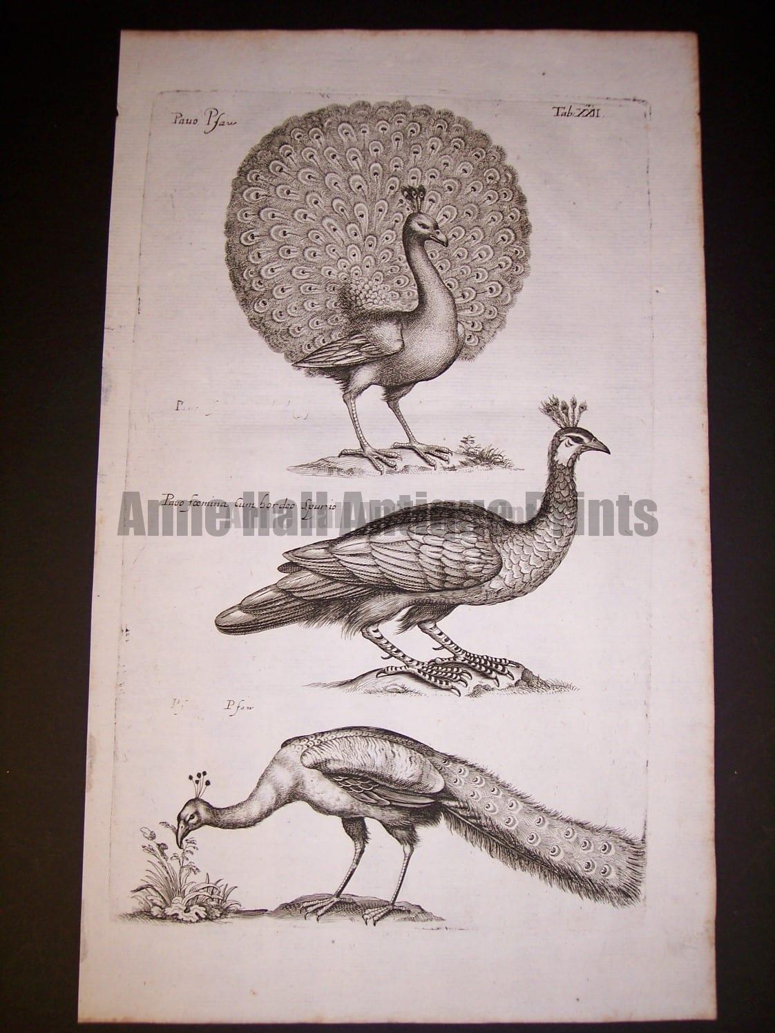 Here are great old copper plate engravings on very fine hand made hand laid linen rag of PEACOCKS by Mathias Merian produced in Nuremberg Germany in 1646!