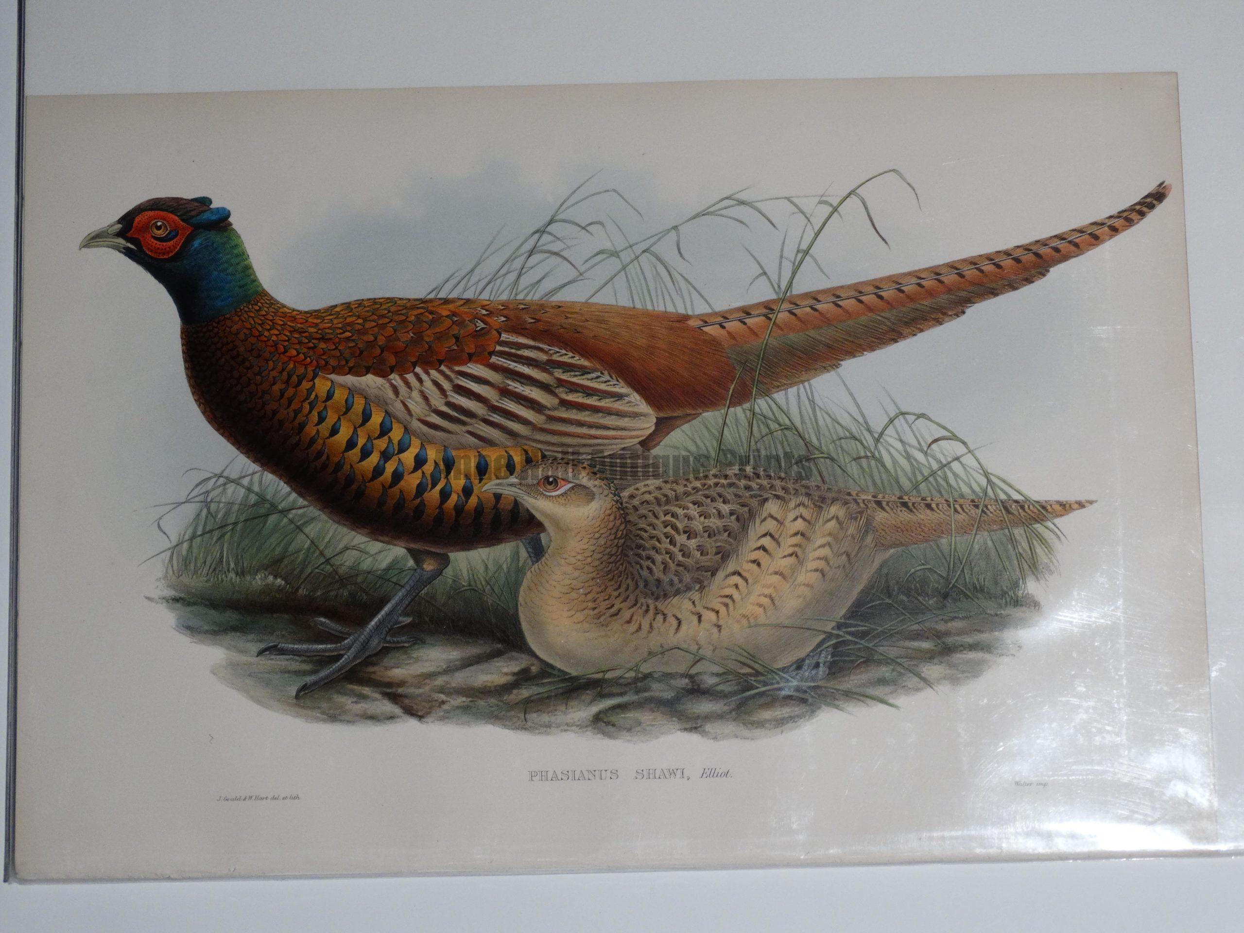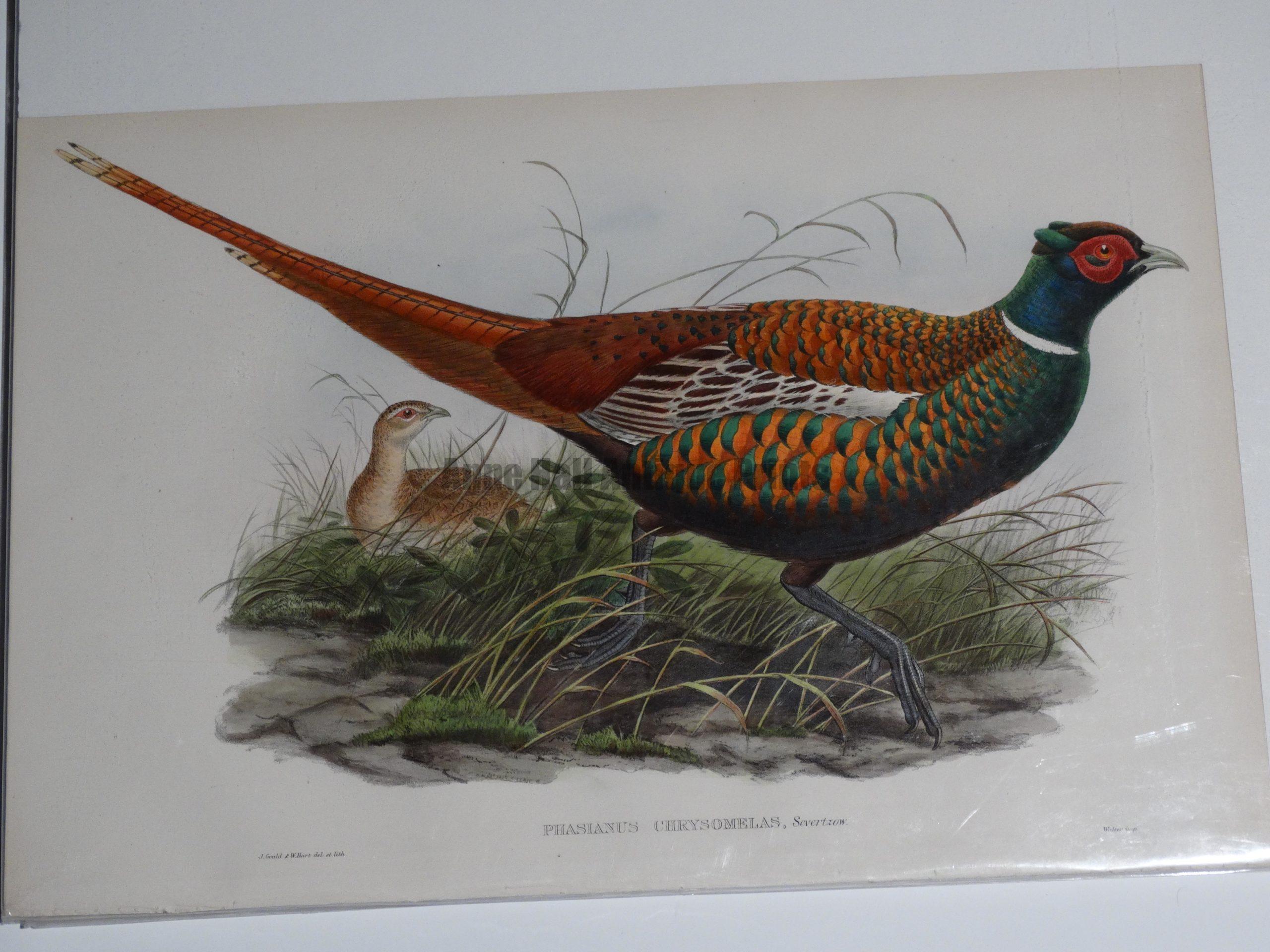 Beautiful originally hand colored antique English lithographs from circa 1860. The pheasants were published for John Gould, perhaps the most remarkable ornithologists of Nineteenth Century England who published some 2999 different birds throughout his career. These two images are his best game birds pheasants.