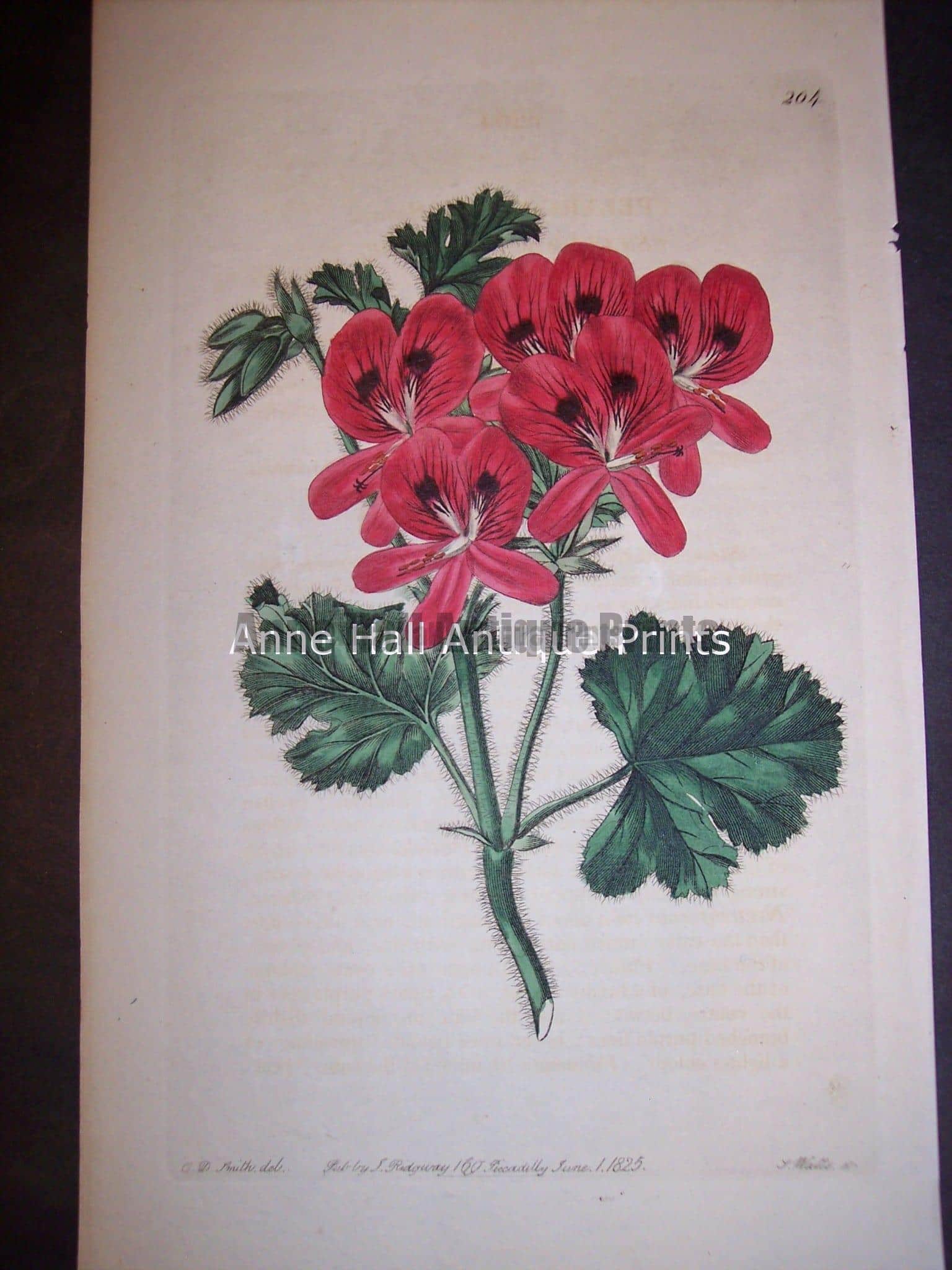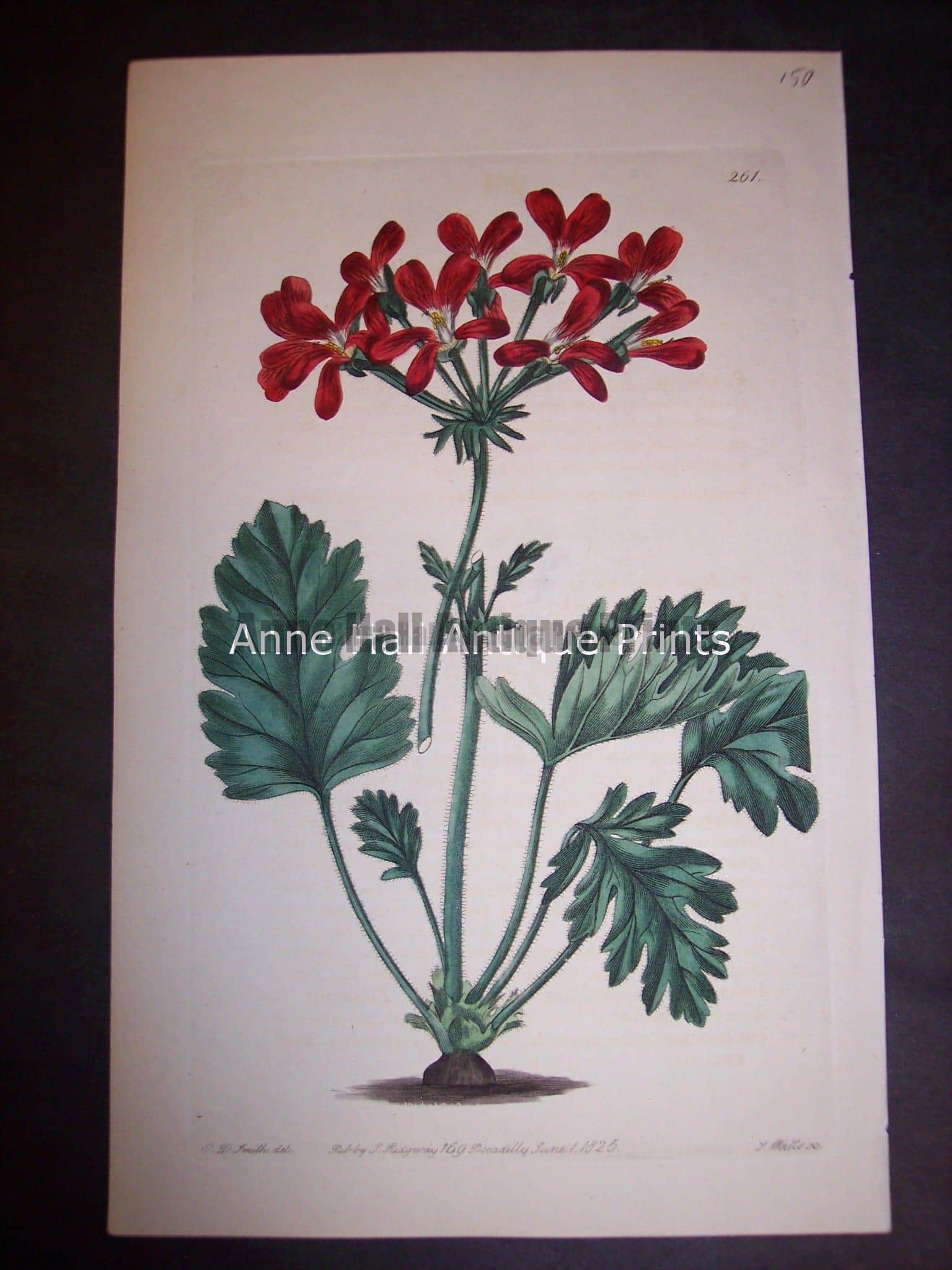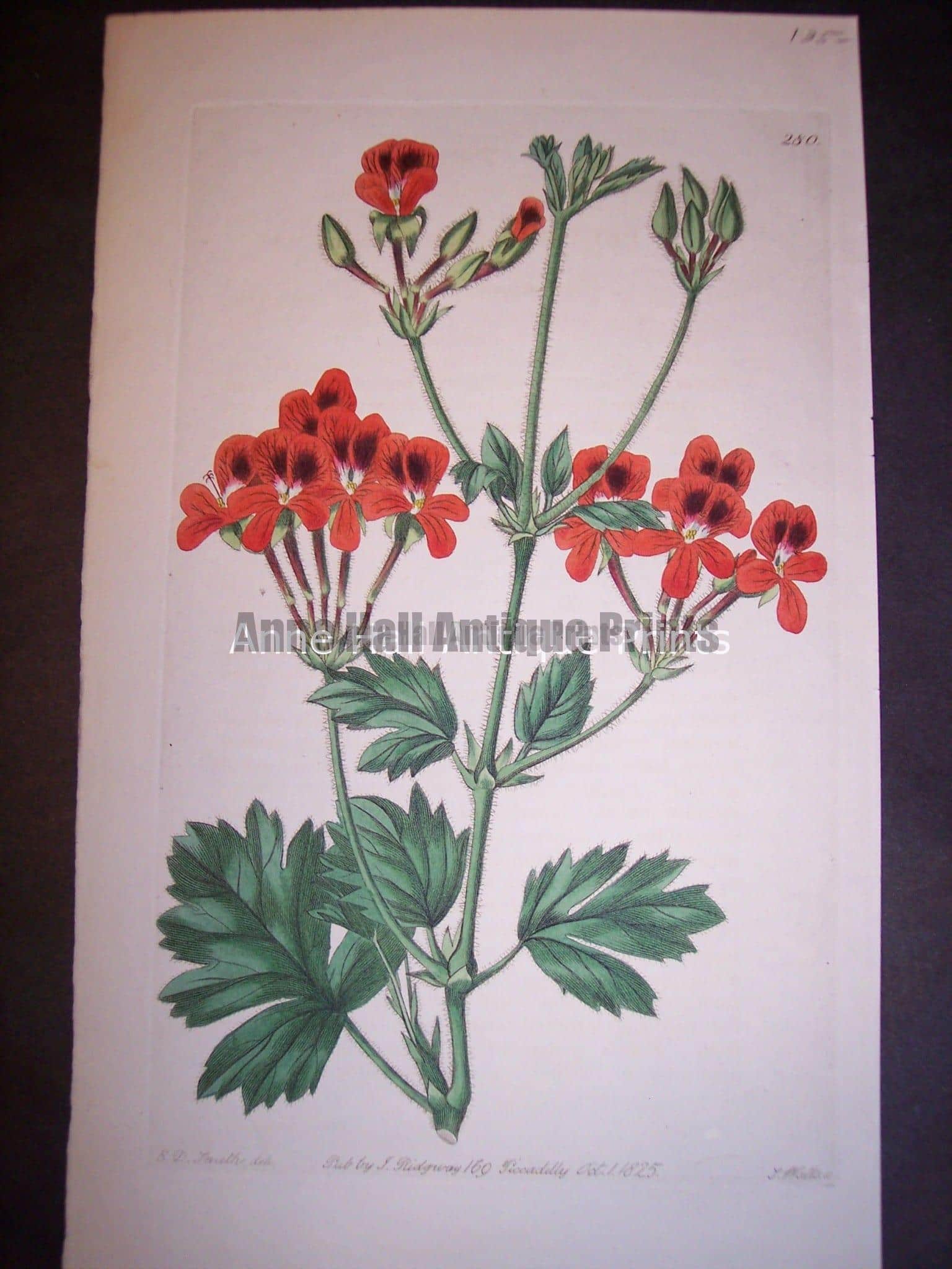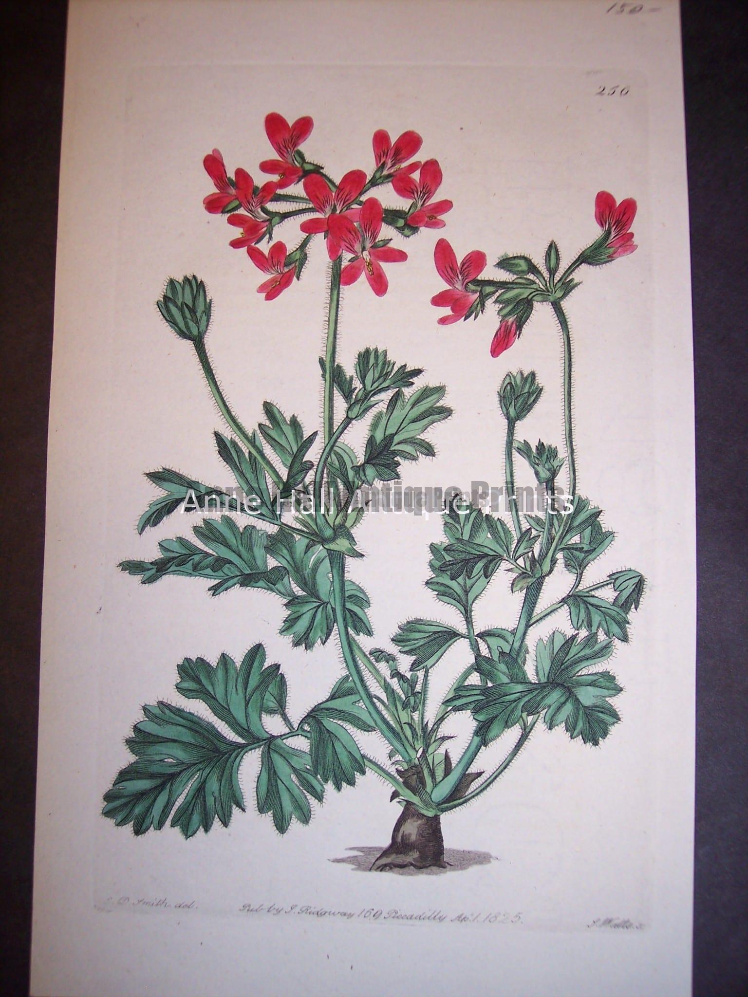 Geraniums antique prints and engravings from centuries ago. For further help pleas email Anne or Mark at oldprint@verizon.net. Or call 413-245-4197 with your special request and to see more.