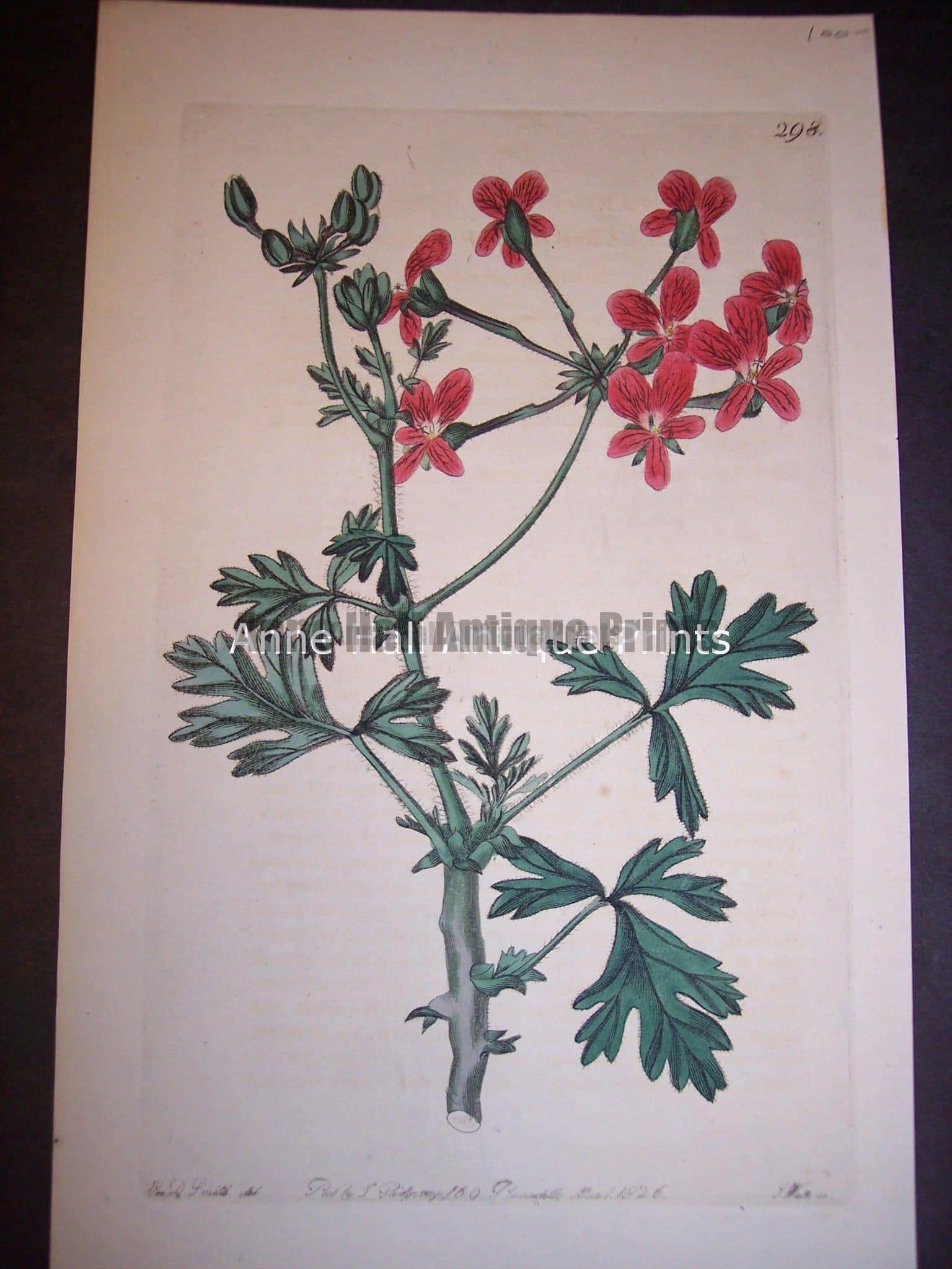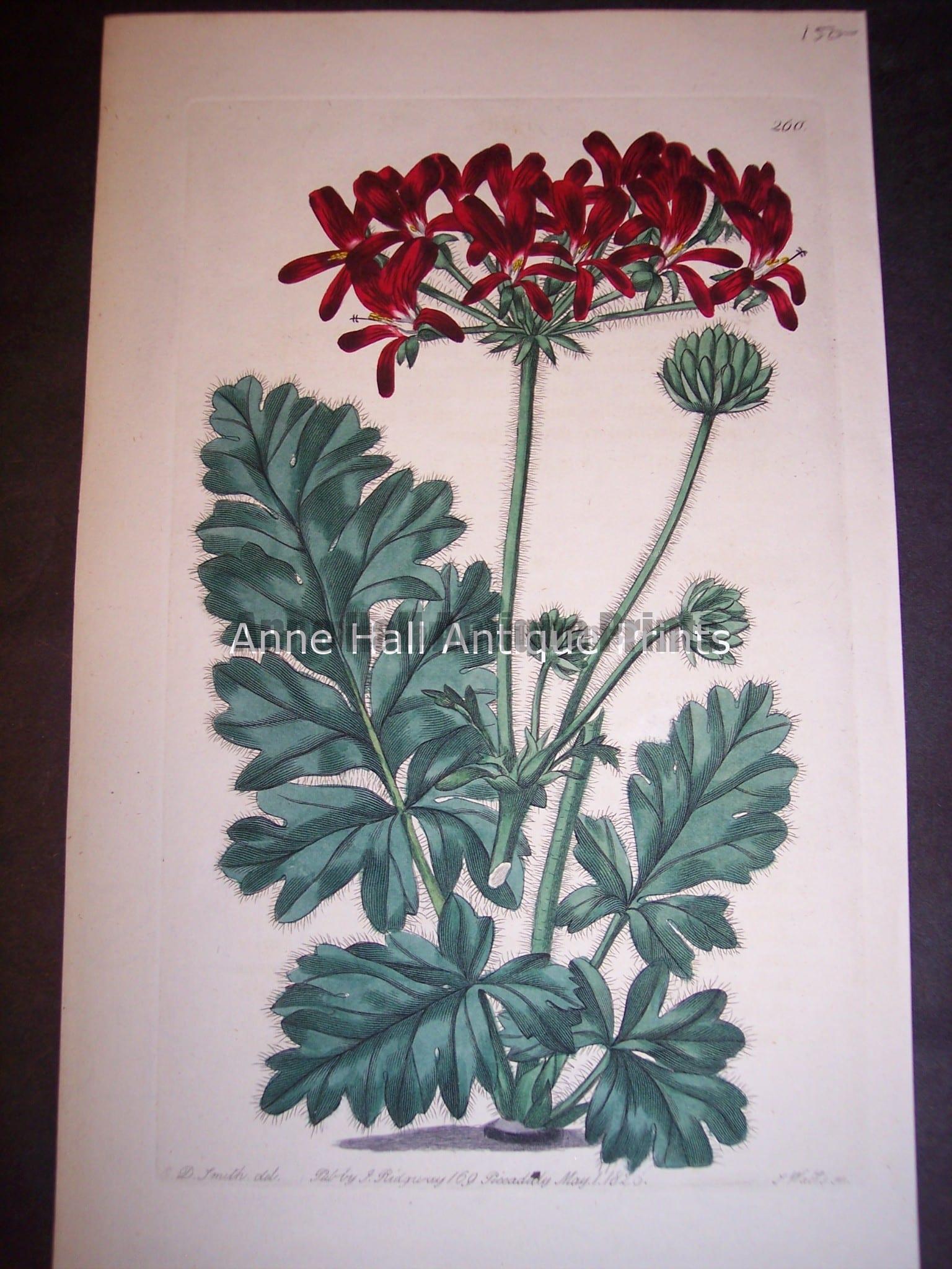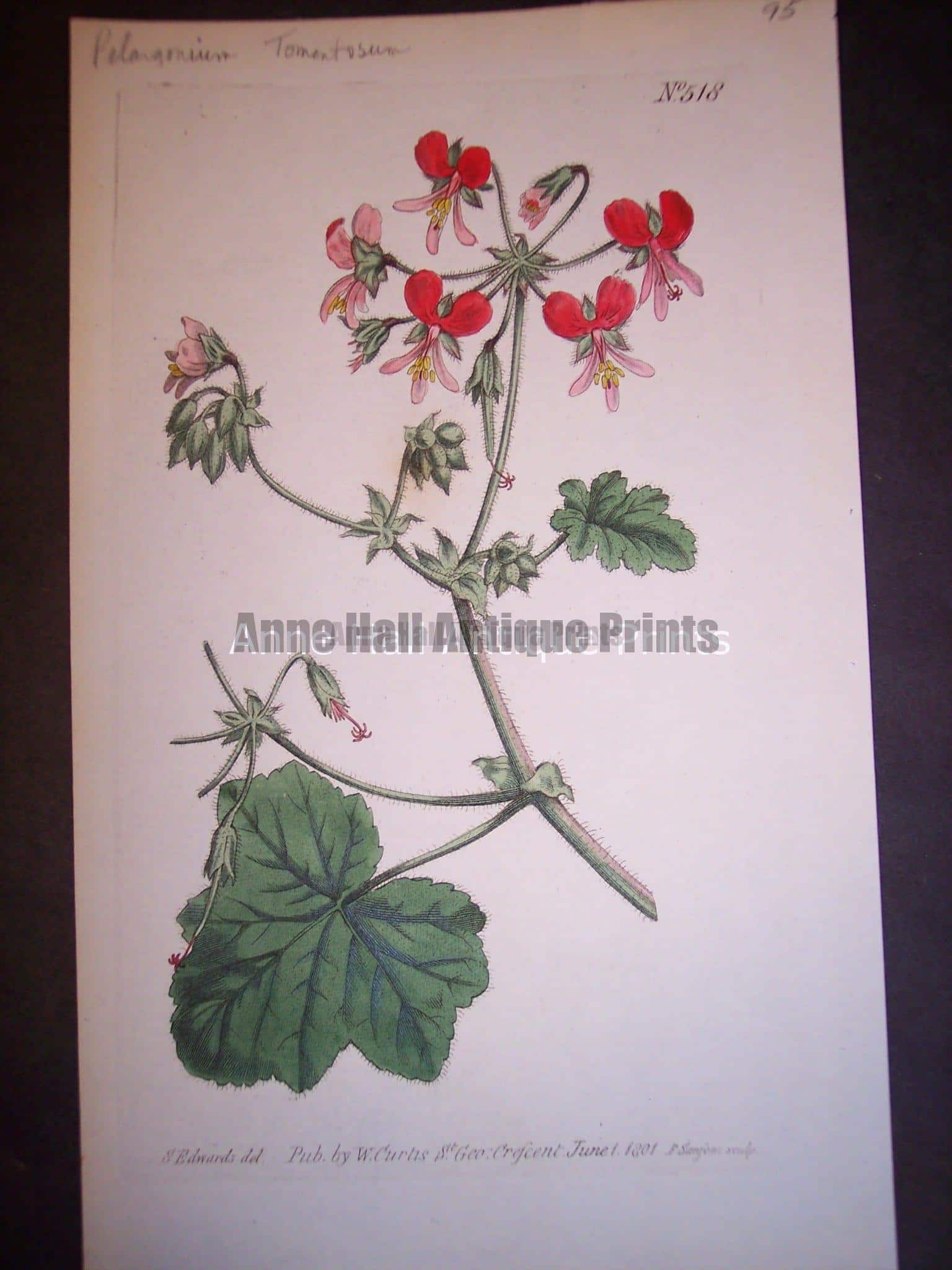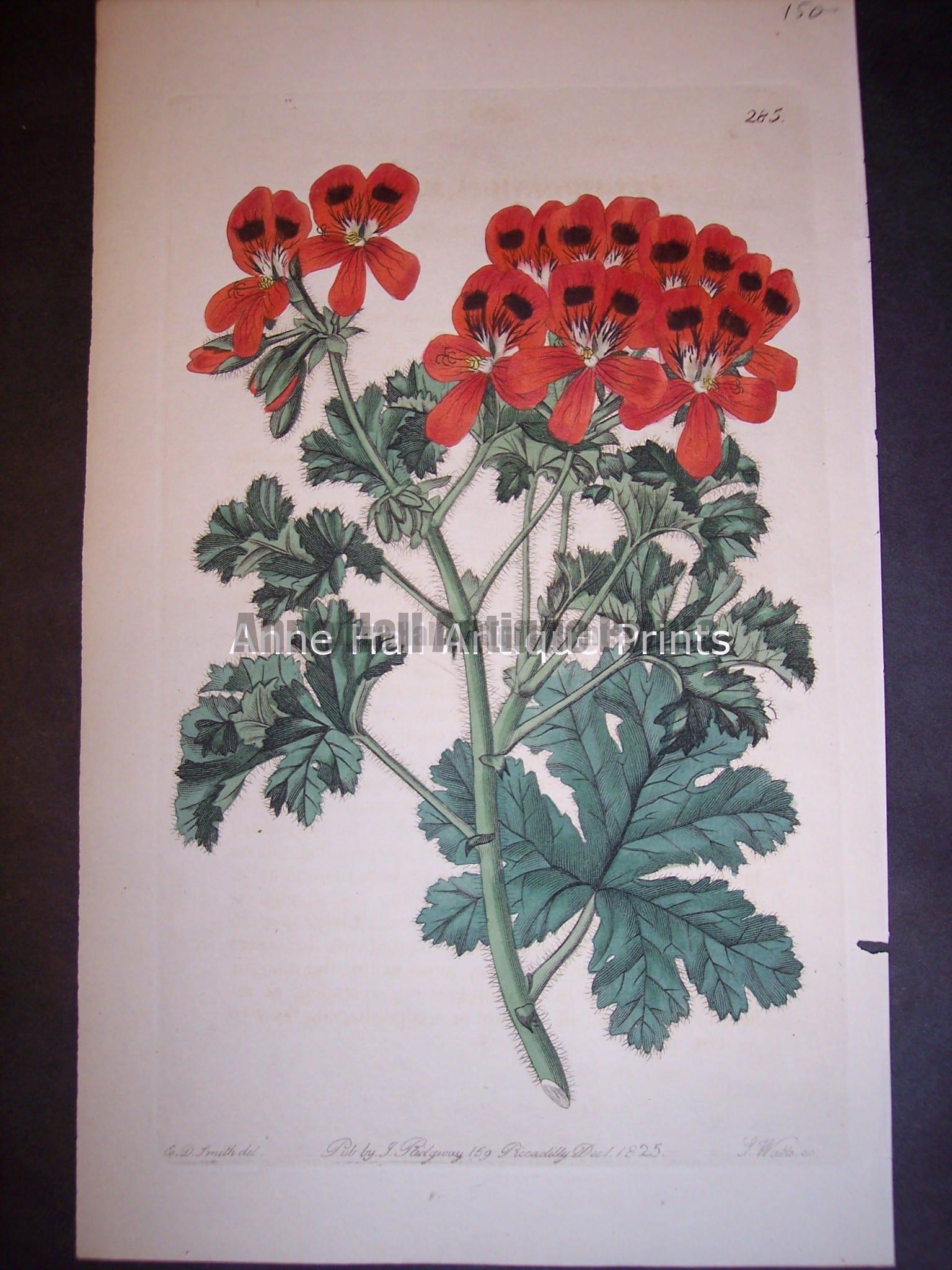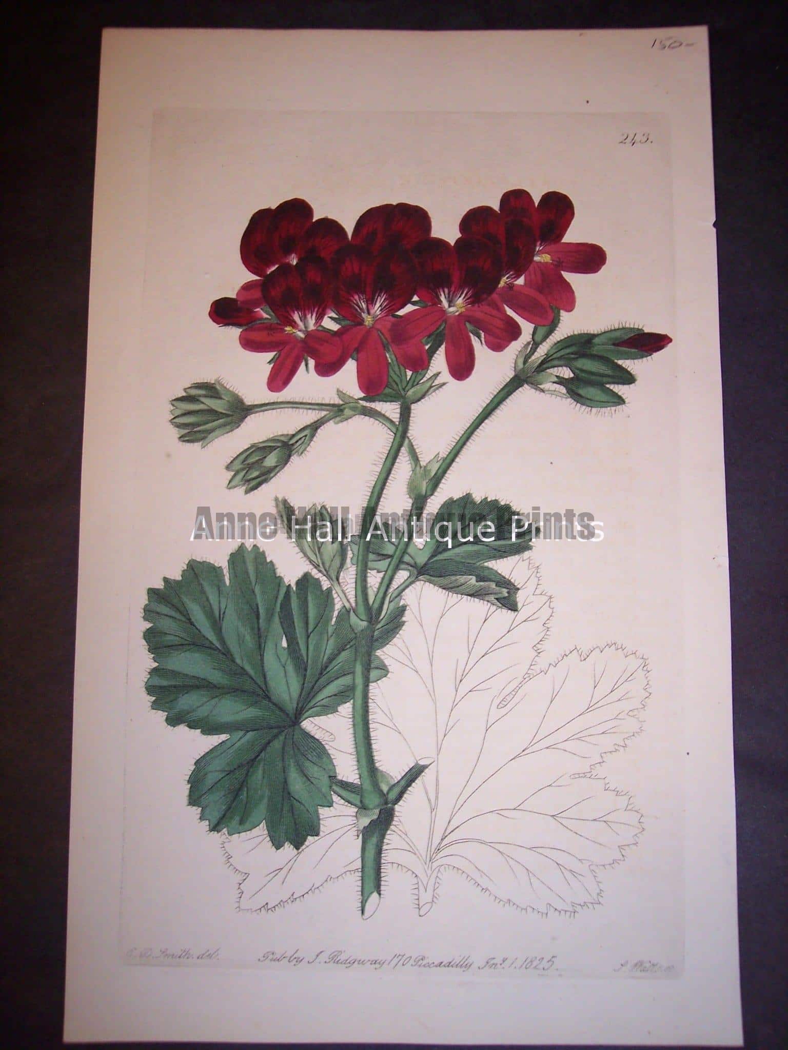 Geraniums antique prints and engravings from centuries ago. For further help pleas email Anne or Mark at oldprint@verizon.net. Or call 413-245-4197 with your special request and to see more.