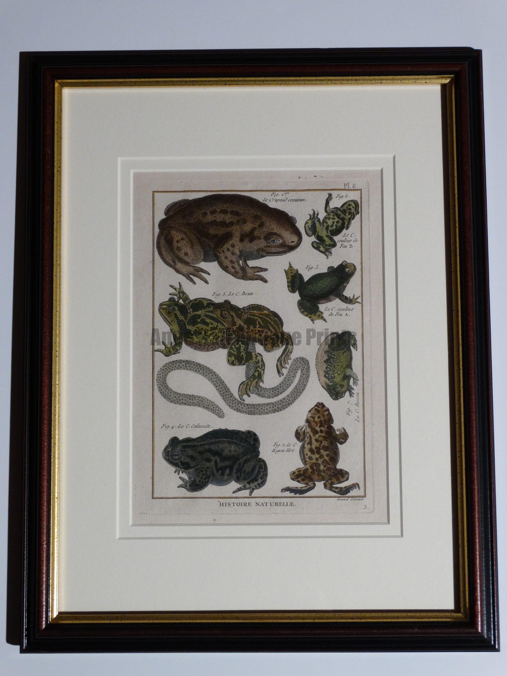 On this page at Anne Hall Antique Prints we sell only originals. Our old engravings & antique lithographs of turtles-frogs, amphibians reptiles all published prior to 1900. Some date back to the early 18th Century. Whether you are creating your own unique décor for a child’s room, complementing your home décor on a wetlands or are collecting images of species you study, we have the amphibians and reptiles you are looking for!